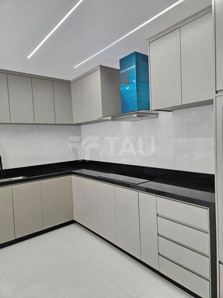 Casa térrea com 3 quartos, sala, banheiro social, área de serviço, cozinha ampla com armários, área verde com grama, churrasqueira e fogão à lenha e vaga de garagem para 8 carros.